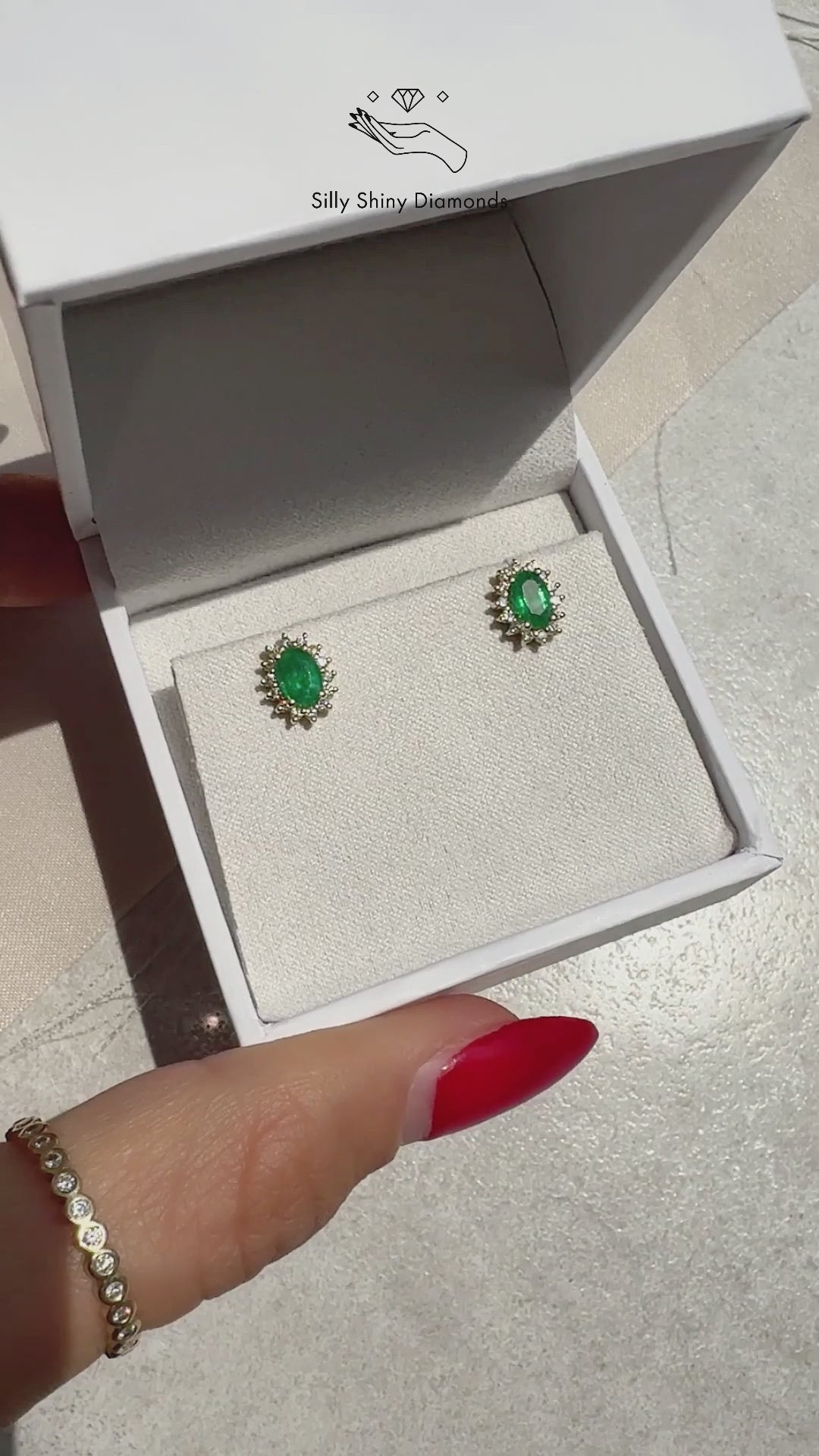 Gorgeous oval emerald diamond halo 14k yellow gold stud earrings.
