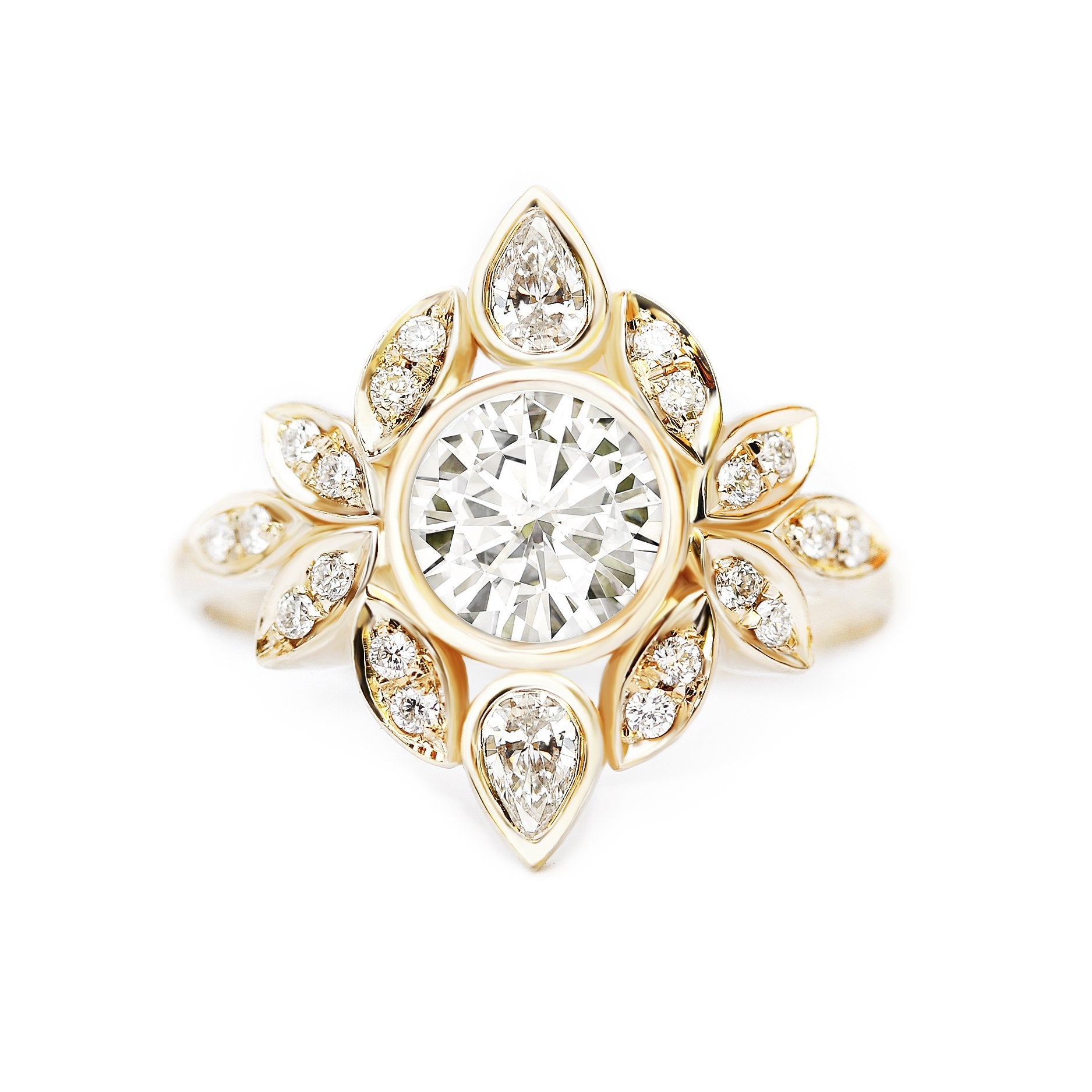 Nature-inspired engagement rings draw from organic shapes, incorporating elements like leaves, vines, and floral motifs to create a harmonious, earthy beauty.