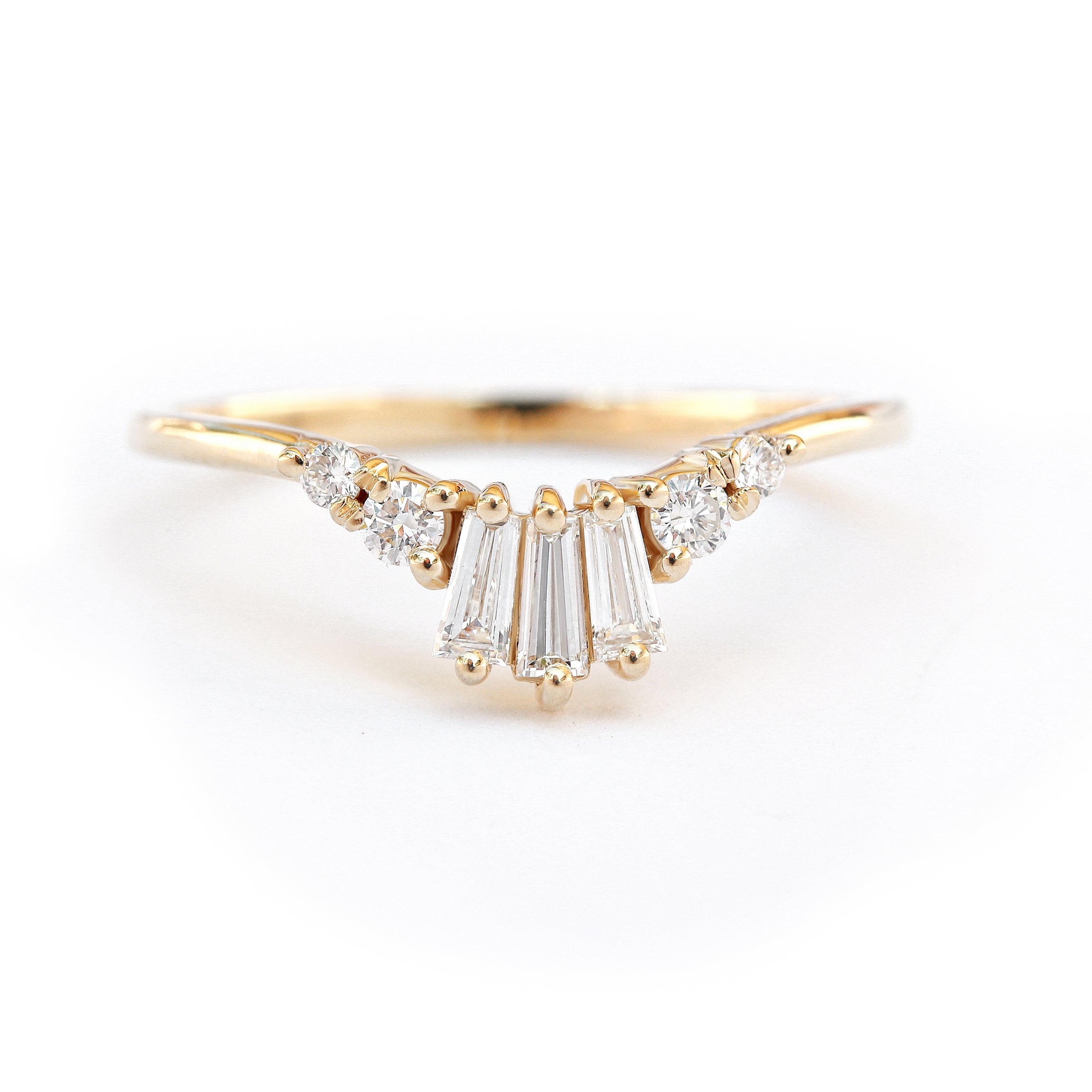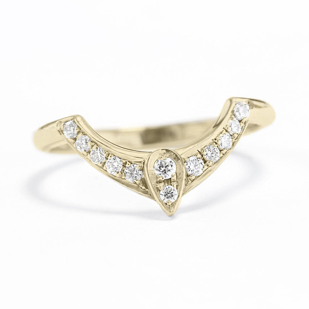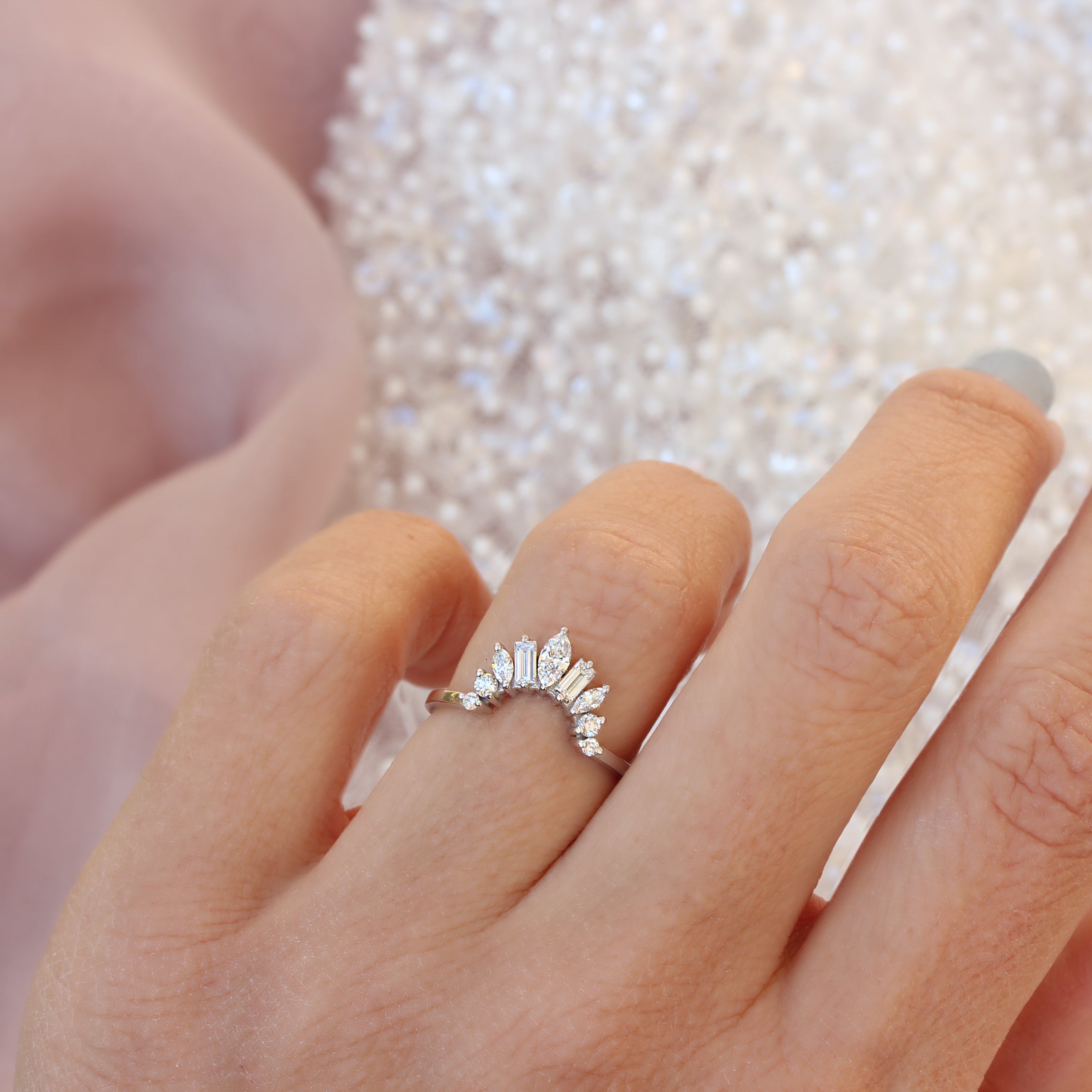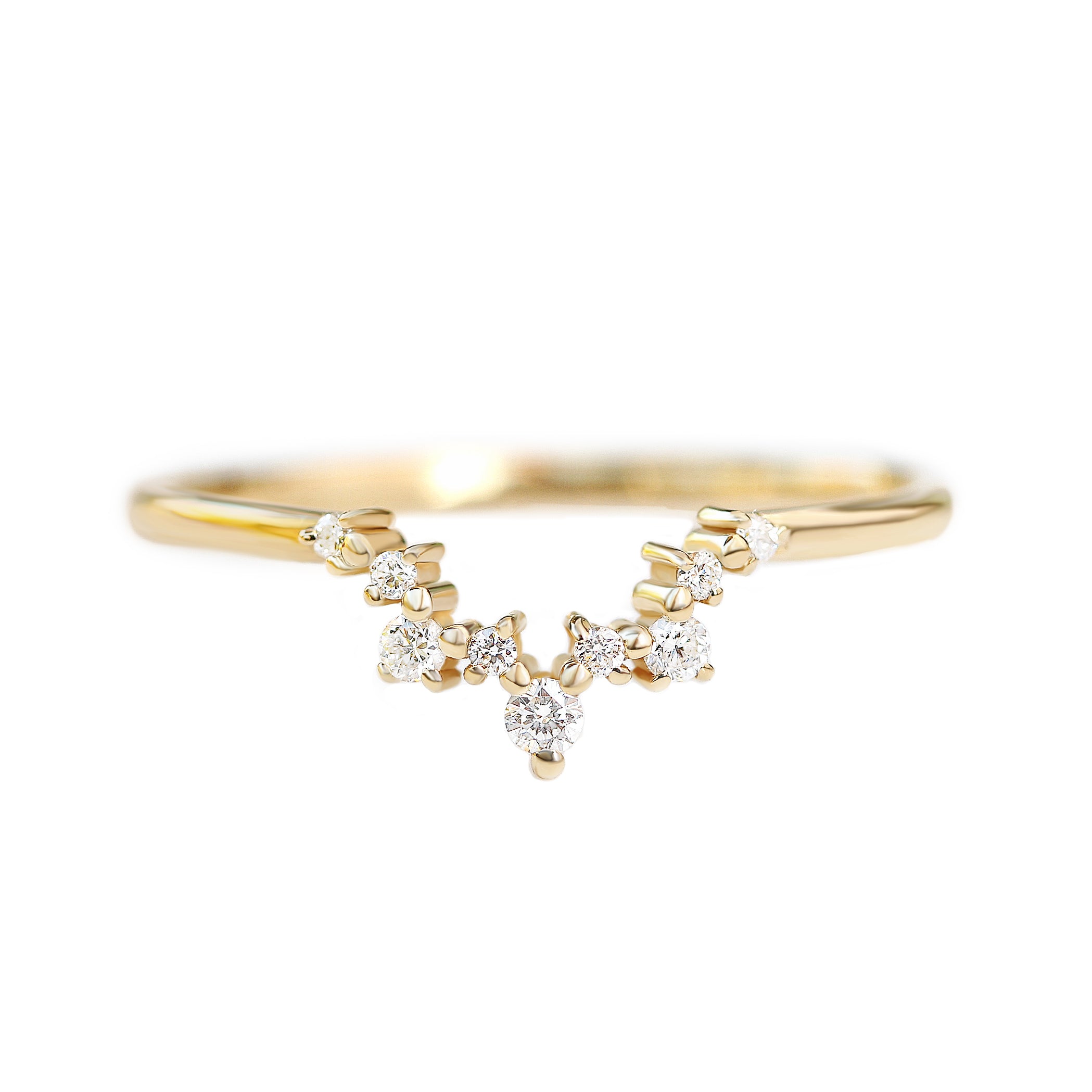 U-curve nesting rings are designed to elegantly contour around engagement rings or stand alone as delicate stackable bands. Their gentle curve enhances any ring stack, adding dimension and symmetry. Available in solid gold with diamond or gemstone accents, these versatile rings create a seamless, customized look.