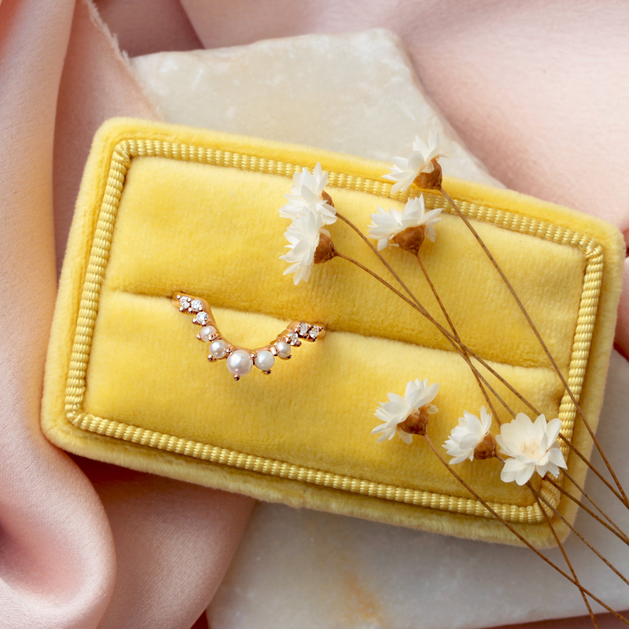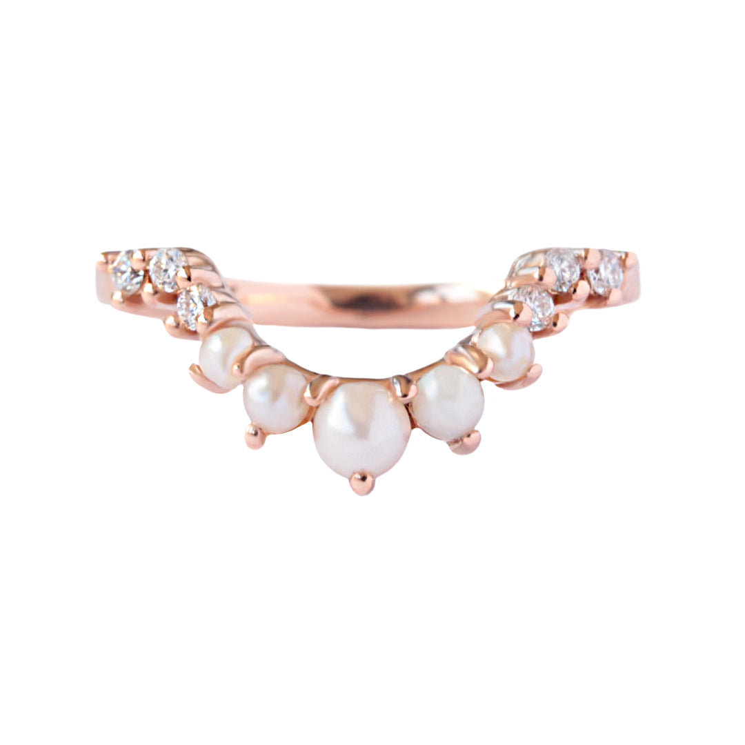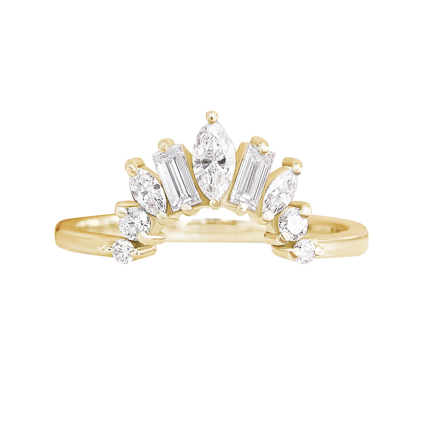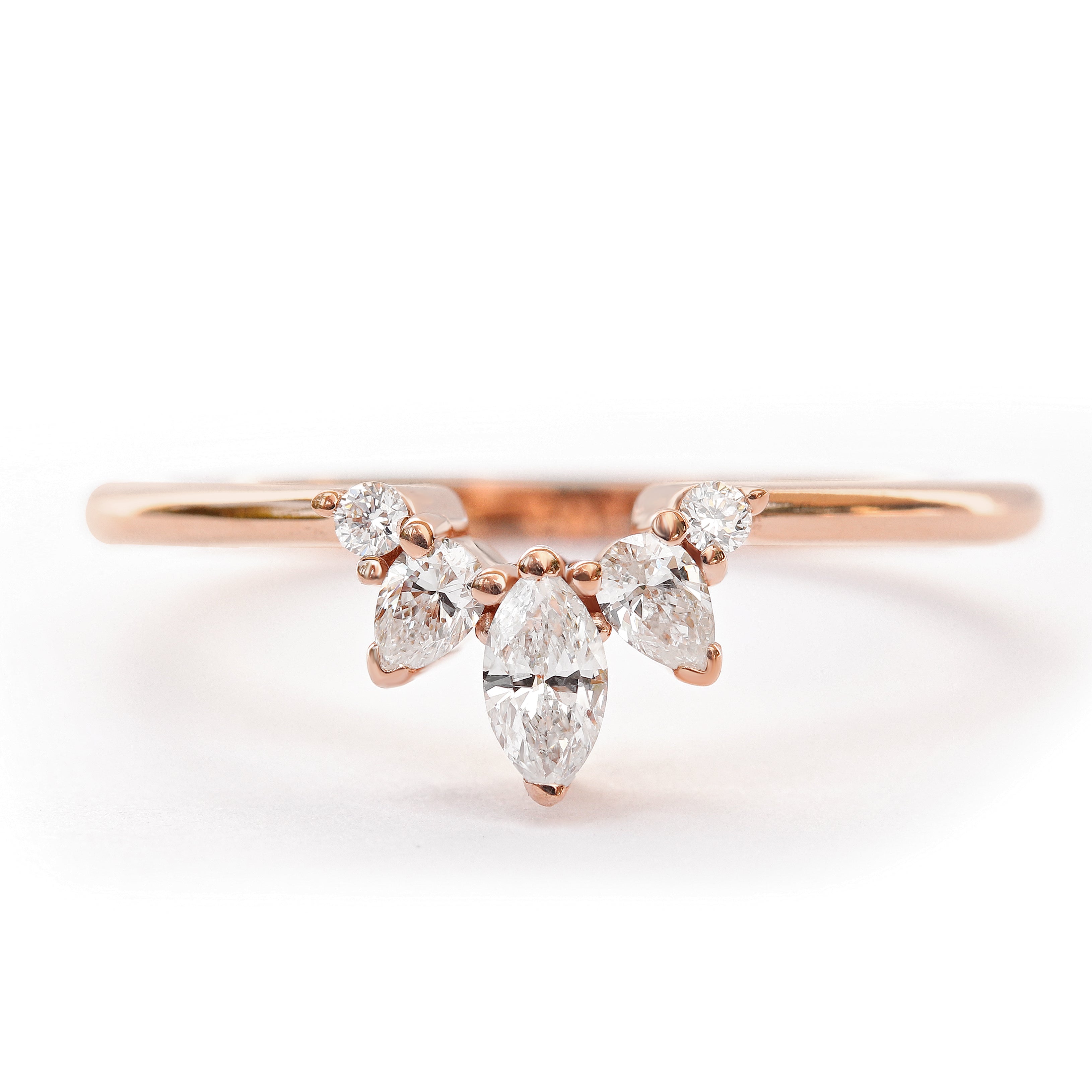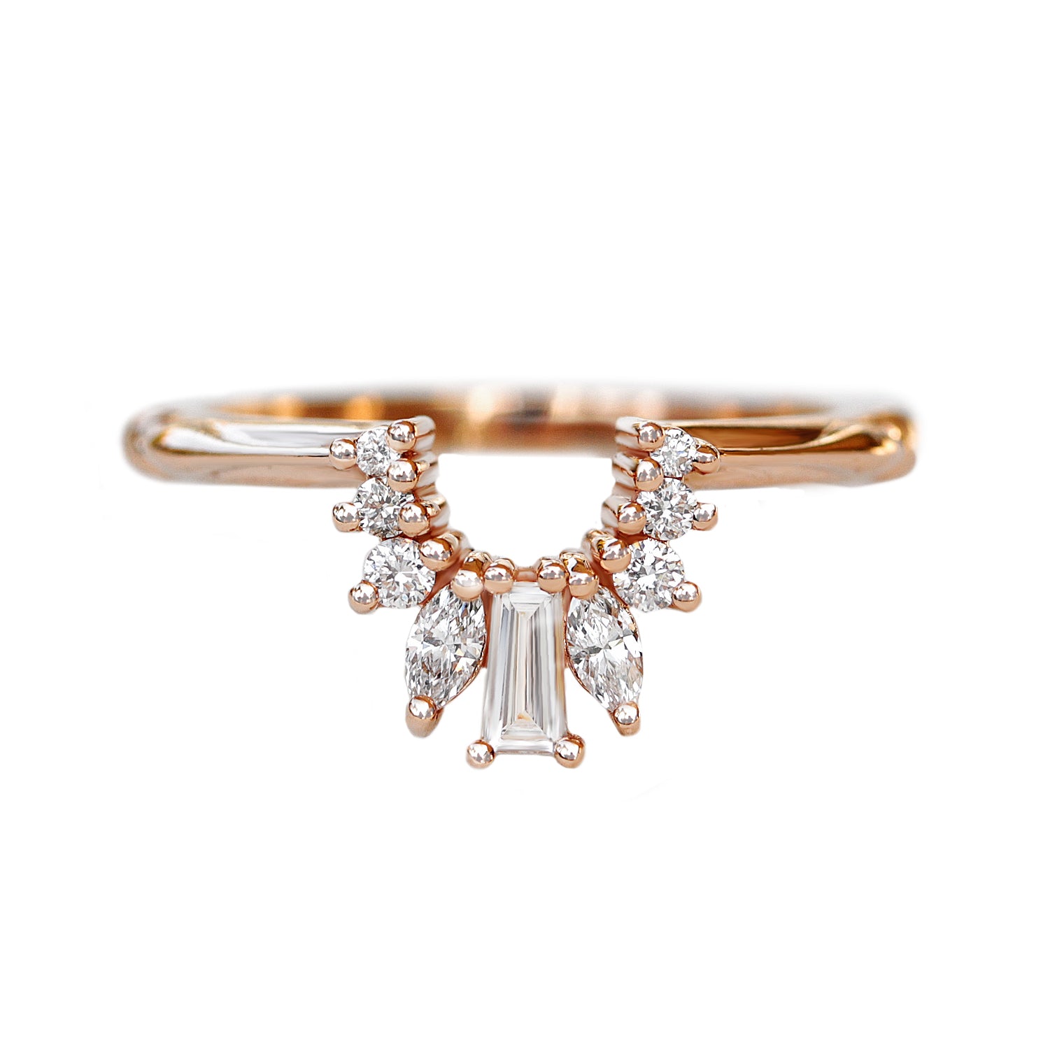 U-curve nesting rings are designed to elegantly contour around engagement rings or stand alone as delicate stackable bands. Their gentle curve enhances any ring stack, adding dimension and symmetry. Available in solid gold with diamond or gemstone accents, these versatile rings create a seamless, customized look.