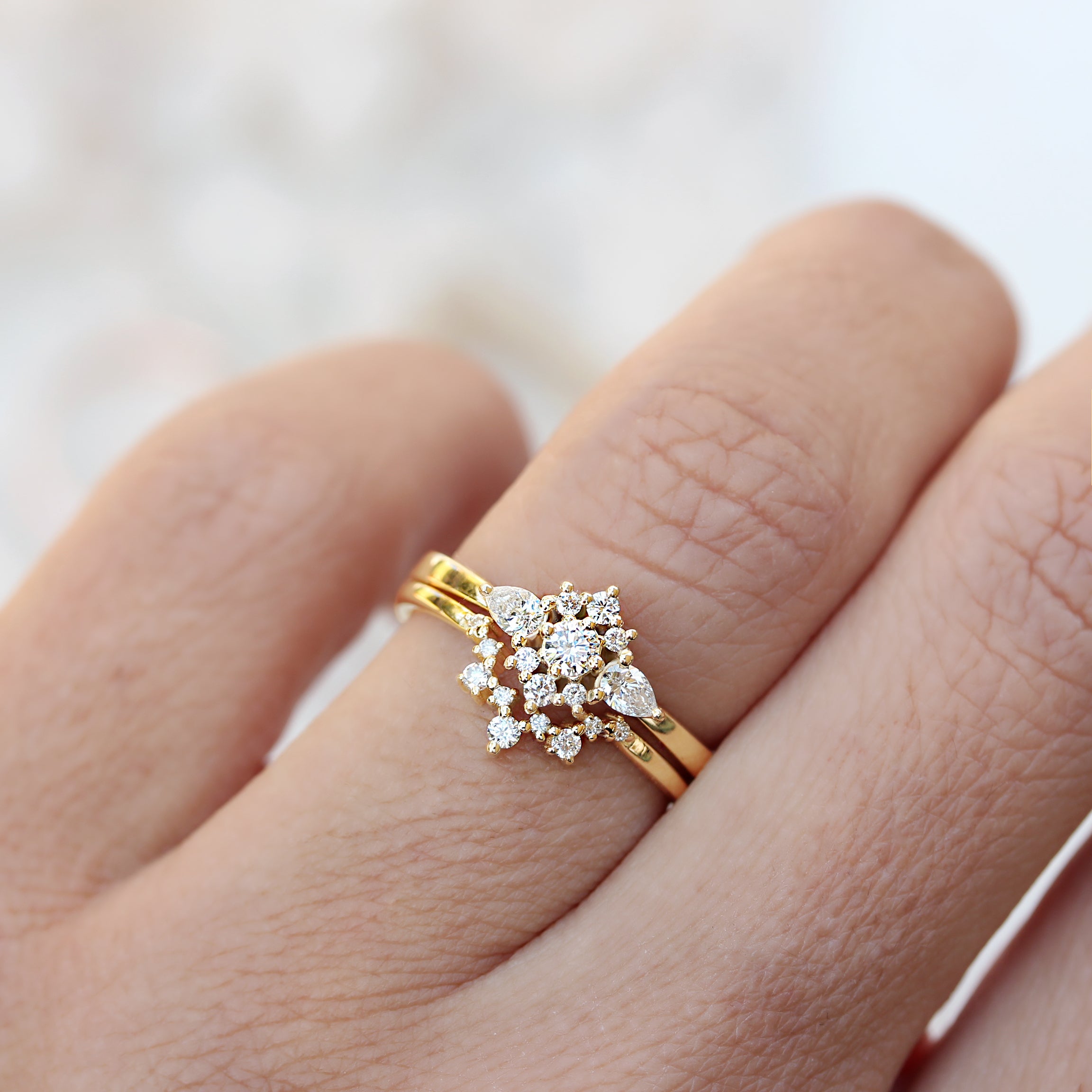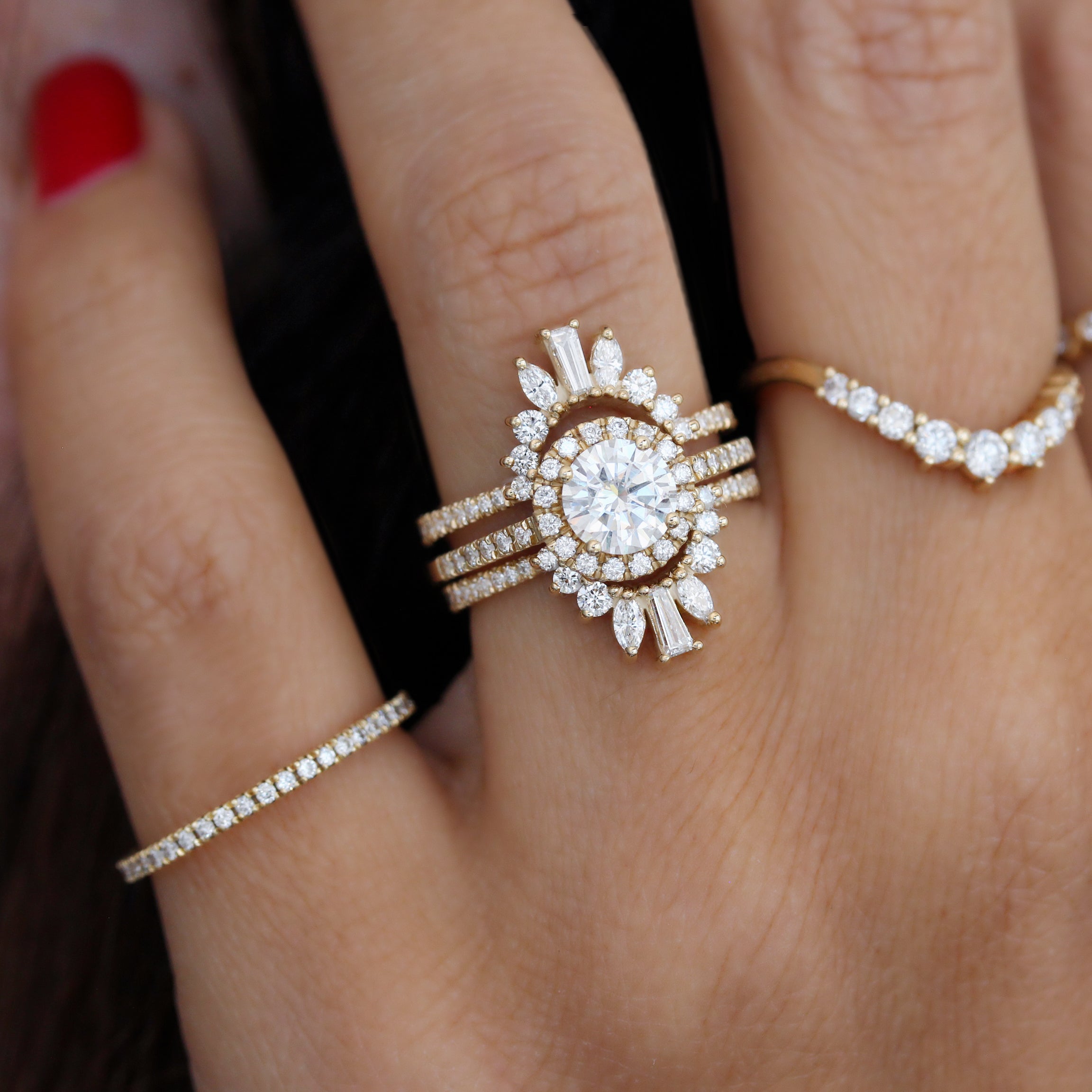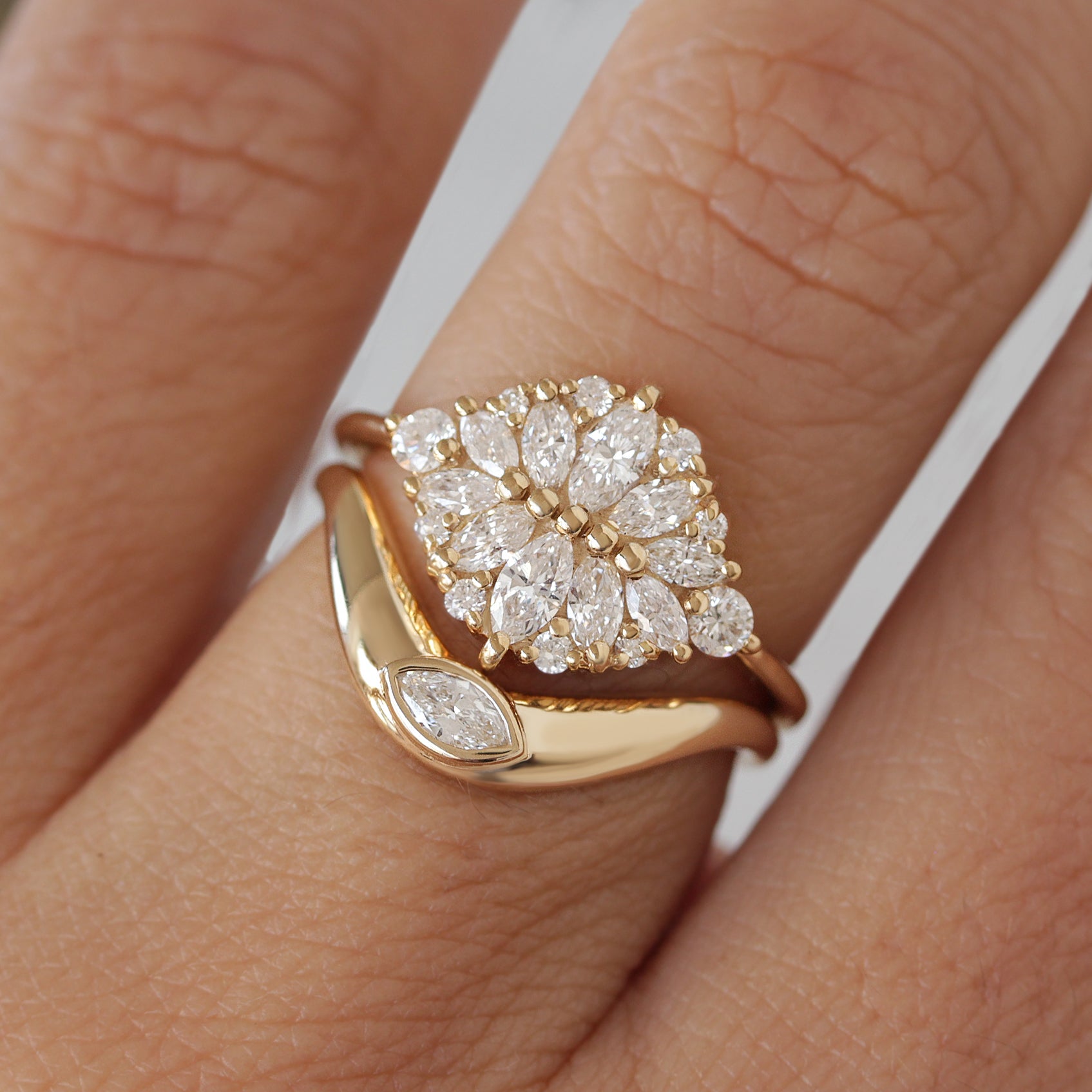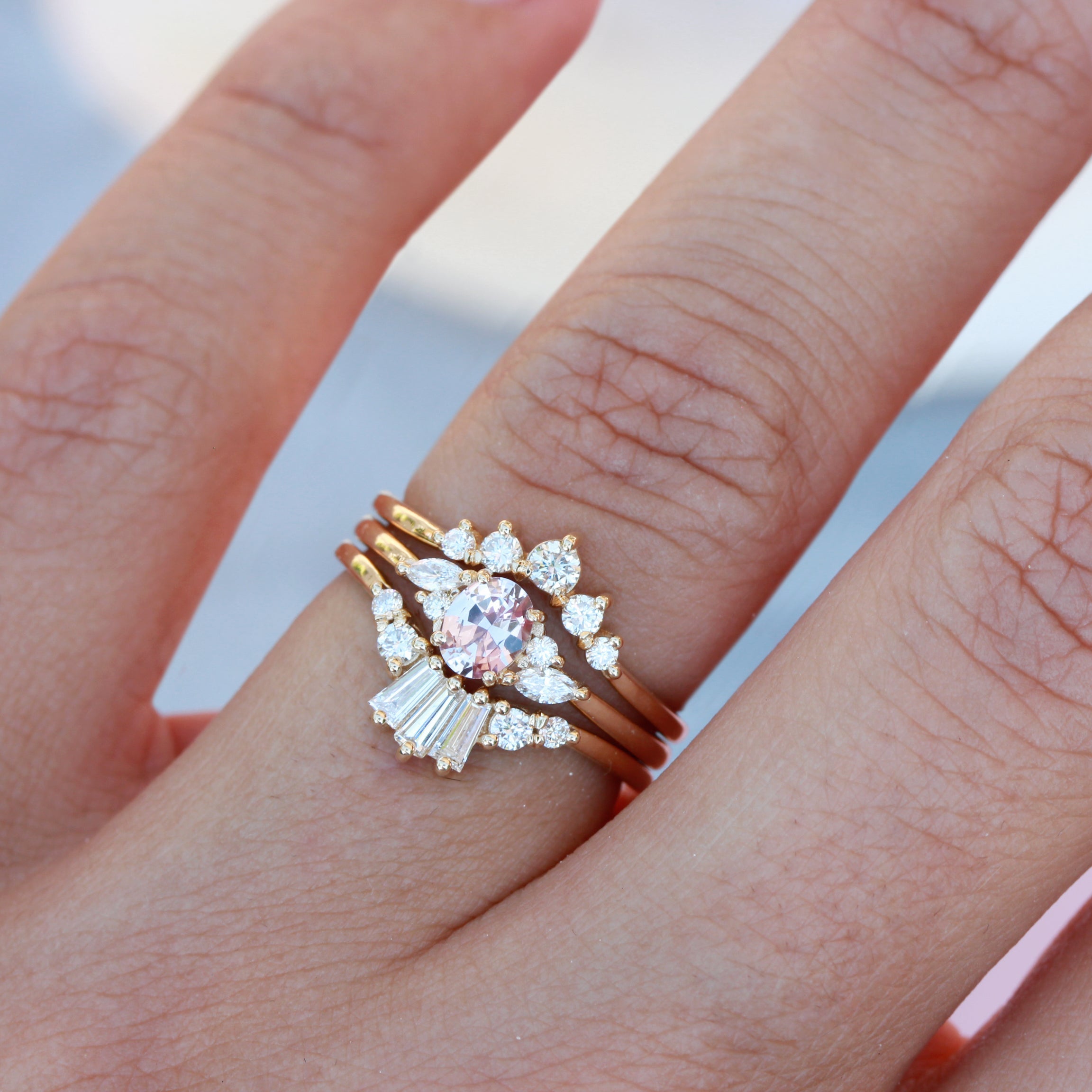 U-curve nesting rings are designed to elegantly contour around engagement rings or stand alone as delicate stackable bands. Their gentle curve enhances any ring stack, adding dimension and symmetry. Available in solid gold with diamond or gemstone accents, these versatile rings create a seamless, customized look.