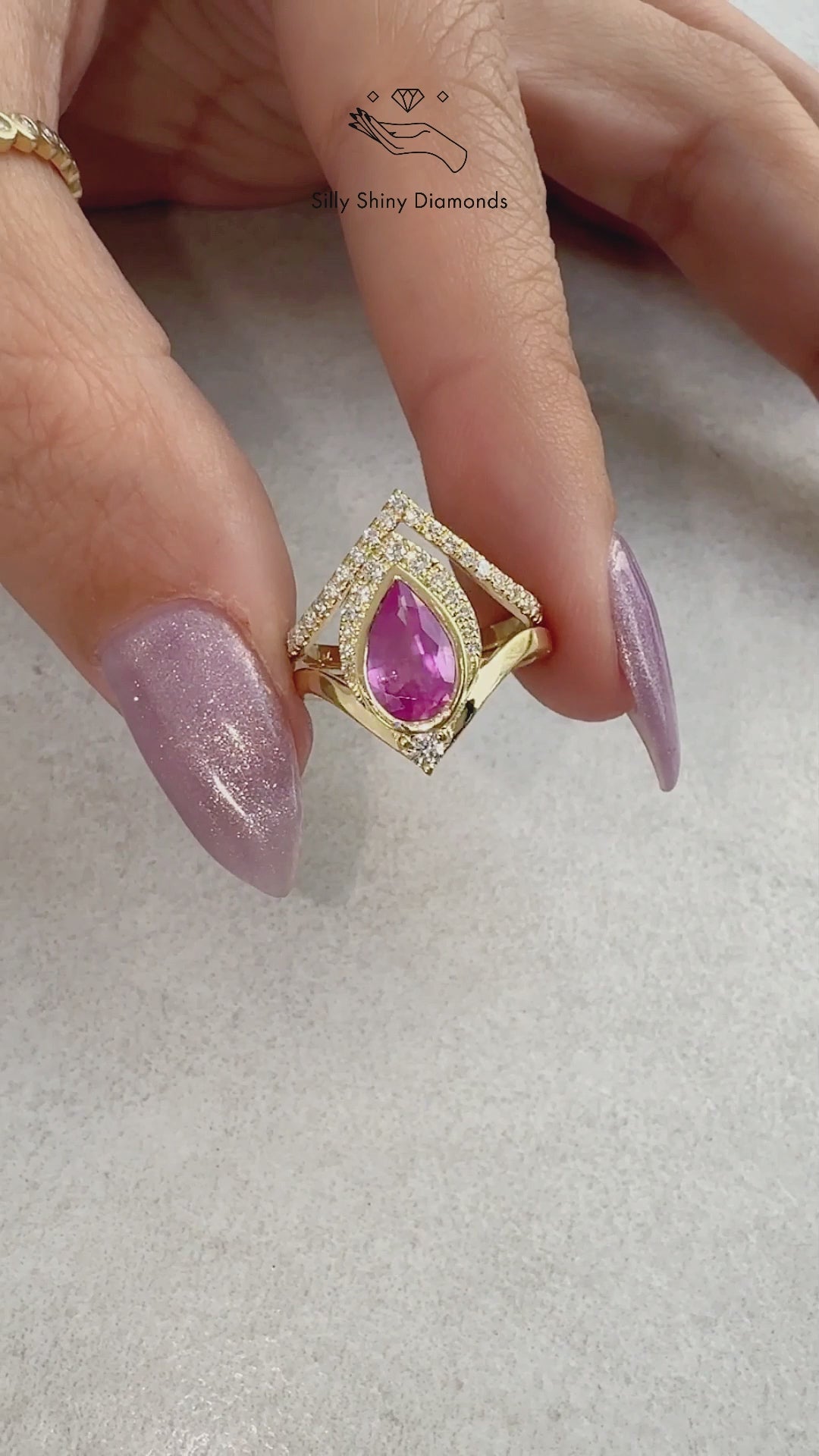Pink Sapphire Pear Shape and Diamonds Halo Unique Engagement Ring Set - Atyasha