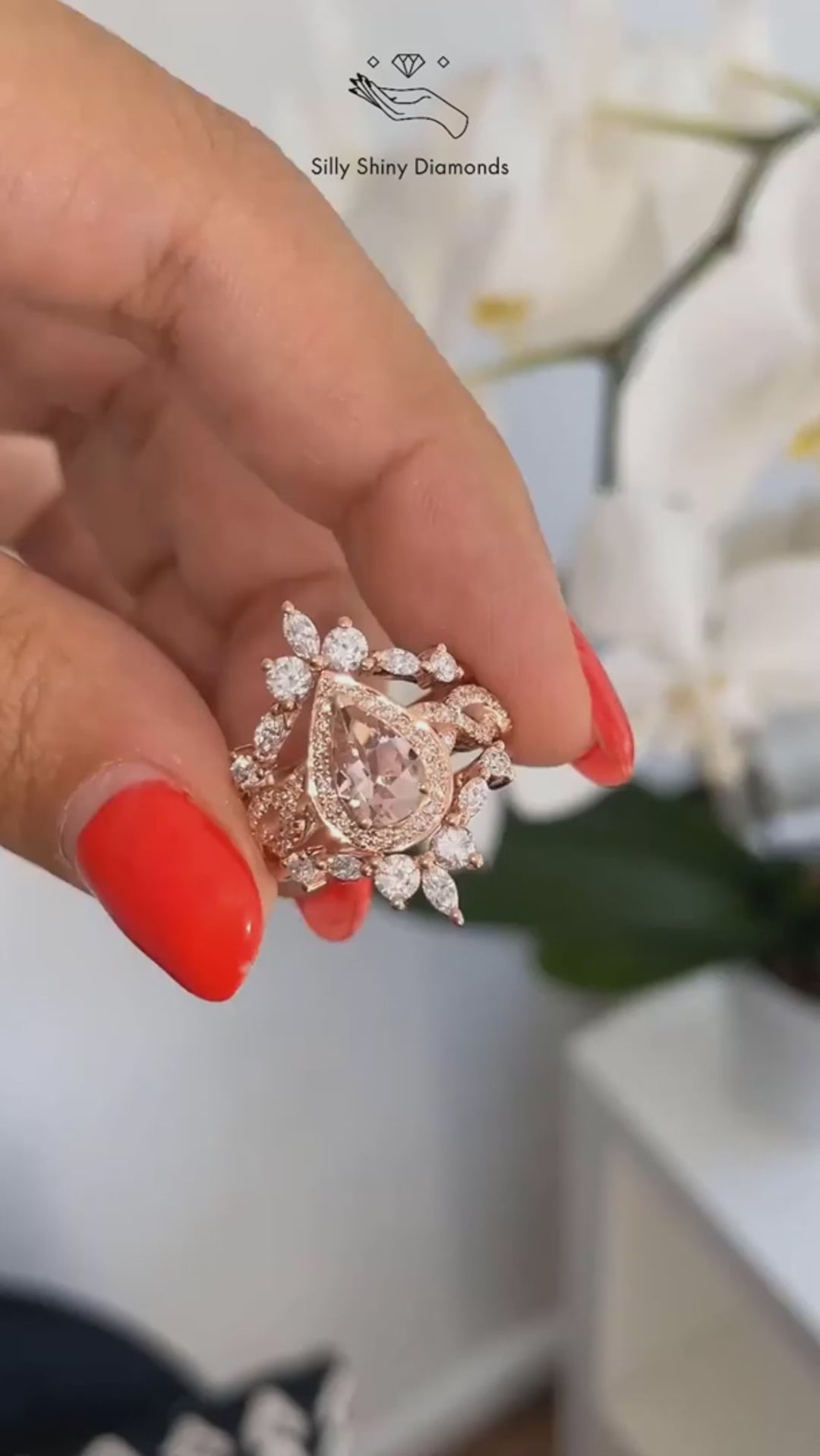 Pear morganite engagement ring with "Iceland" ring guard.
