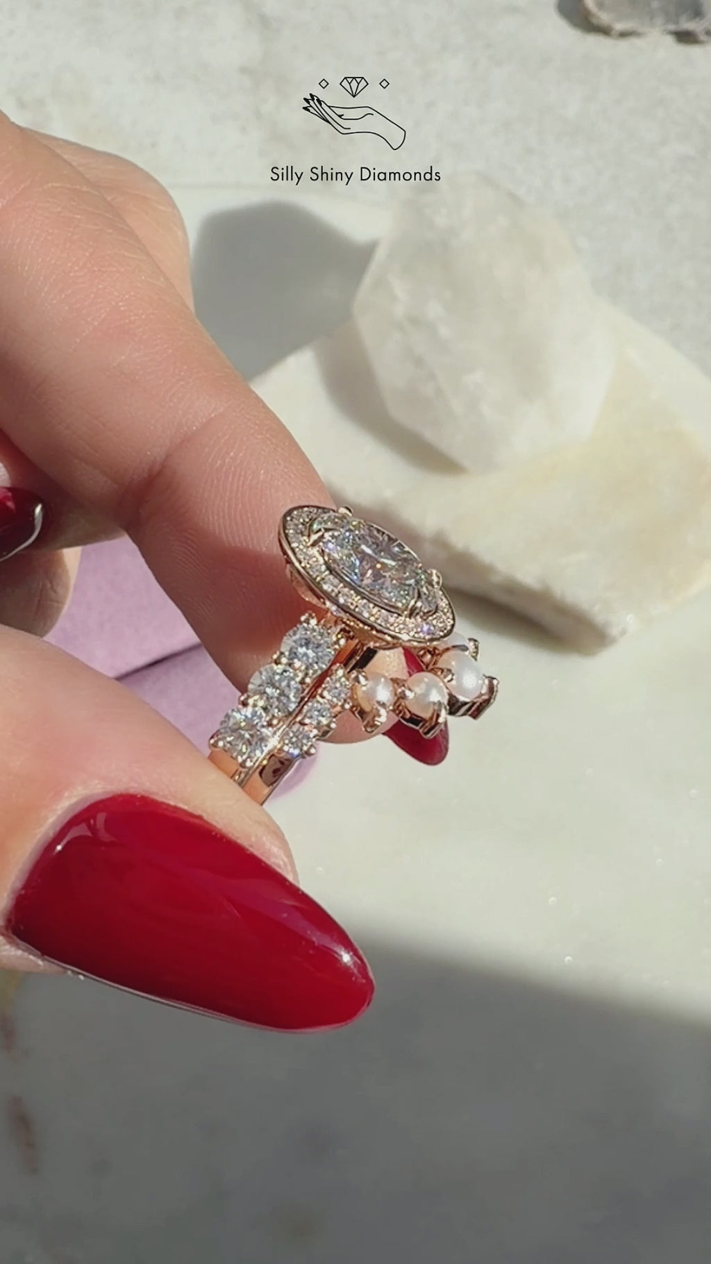 Oval Diamond Halo 1.5ct Engagement Ring Scarlett pearls and diamond nesting ring rose gold