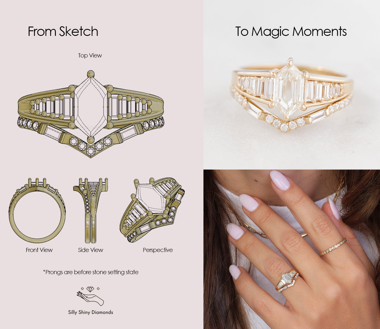 כל תכשיטי Silly Shiny Diamonds מעוצבים ומיוצרים בעבודת יד בסטודיו שלנו. אנחנו עושים הכל מההתחלה ועד הסוף. אנחנו אוהבים והמומחיות שלנו ליצור תכשיטים אישיים ועשויים במיוחד בשבילכם! לכן שירות עיצוב התכשיטים שלנו אינו כרוך בתשלום.